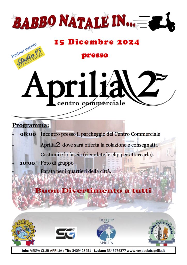 La quarta edizione di “Babbi Natale in Vespa” è in programma per questa domenica 15 Dicembre. Le iscrizione sono ancora aperte e sono gratuite. Il raduno è fissato alle 8.00 presso il parcheggio del centro commerciale “Aprilia2”, che ha partecipato fattivamente all'iniziativa, donando i vestiti di Babbo Natale.