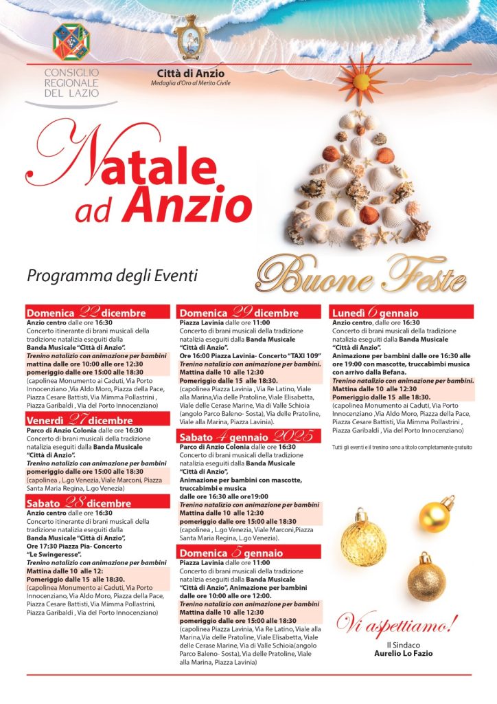 Improntato ad Anzio, in tempi record, il programma degli eventi natalizi. Trenino per i bambini, musica dal vivo ed animazione in centro, ma anche in periferia: ad Anzio Colonia e Lavinio Mare. Tutti gli eventi, da domenica 22 dicembre a lunedì 6 gennaio, saranno a titolo gratuito. Si parte questa domenica alle 16.30 con il concerto itinerante della banda Città di Anzio che eseguirà brani musicali della tradizione natalizia. Dalle 10.00 alle 12.30 e dalle 15.00 alle 18.30 sarà in funzione anche il trenino natalizio e ci sarà animazione per bambini.