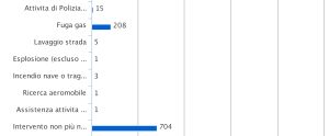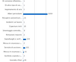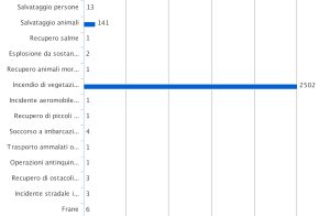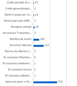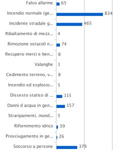 Passando all’attività di soccorso svolta, ad oggi sono stati effettuati 8171 interventi. Il maggiore impegno alle squadre è stato richiesto per interventi in situazioni di: incendi, incidenti stradali, soccorso a persone, incendi boschivi e di interfaccia, nell’ambito della campagna AIB, e condizioni climatiche avverse. Nel diagramma che si fornisce sono riportati i numeri degli interventi effettuati, distinti per tipologia.