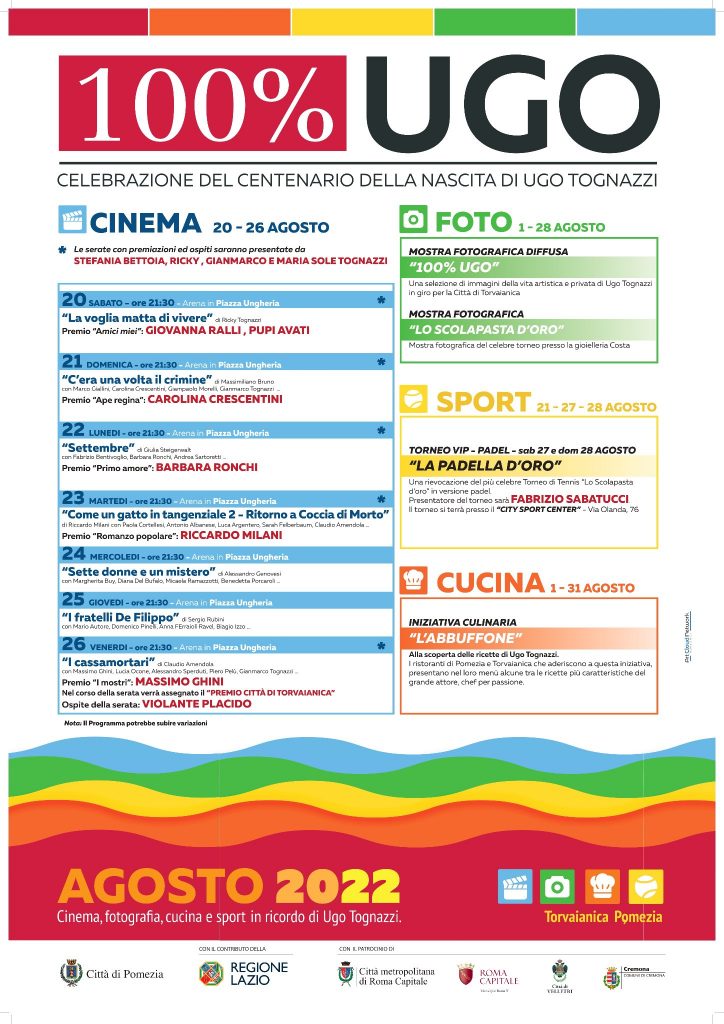 Da sabato 20 a venerdì 26 agosto, a Torvaianica, presso l’arena di Piazza Ungheria - nell’ambito della manifestazione organizzata per i cento anni dalla nascita di Ugo Tognazzi – ci sarà la rassegna cinematografica “100% Ugo Tognazzi”. Domenica 21 agosto, inoltre, è in programma la “Regata di vela omaggio ad Ugo”.