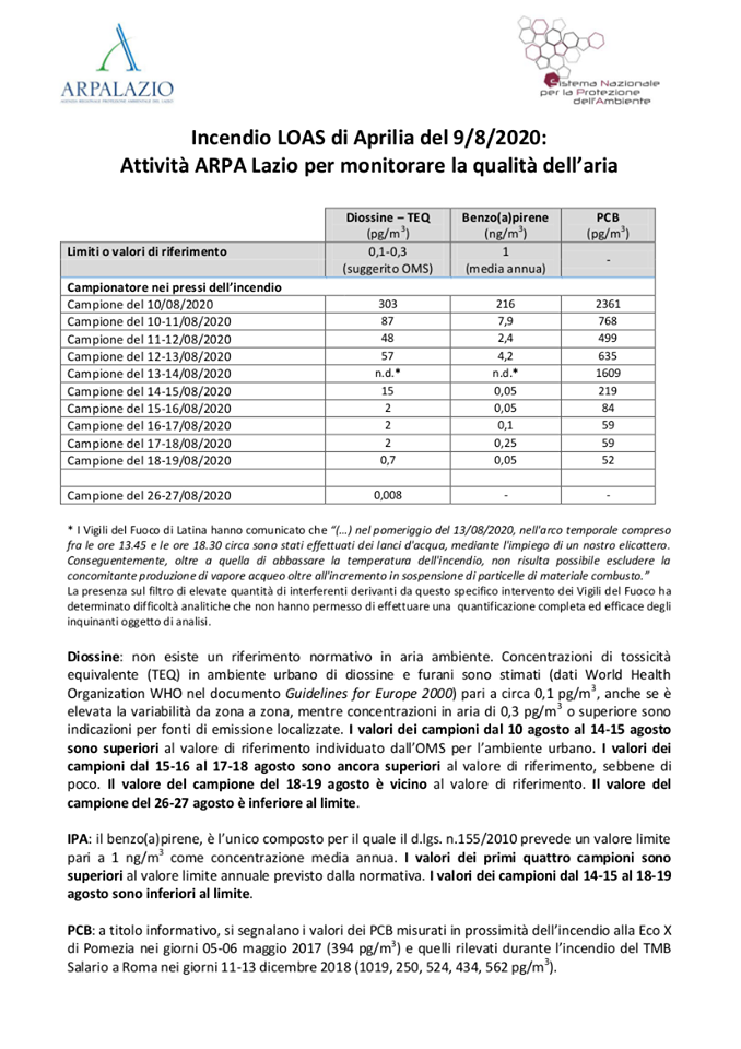 Incendio alla Loas di Aprilia: completate le analisi dell’Arpa Lazio per la diossina, analisi eseguite sul nuovo campione preso tra il 26 e il 27 agosto su richiesta della ASL. I valori per fortuna appaiono nettamente inferiori agli standard indicati dall'OMS.