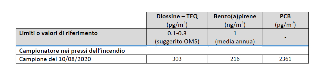 Per quanto riguarda i PCB, a titolo informativo, si segnalano i valori dei PCB misurati in prossimità dell’incendio Eco X (Via Pontina Vecchia, Pomezia) nei giorni 05-06 maggio 2017 pari a 394 pg/m3 e quelli rilevati presso l’impianto durante l’incendio del TMB (via Salaria, Roma) nei giorni 11-13 dicembre 2018 (1019, 250, 524, 434, 562 pg/m3).