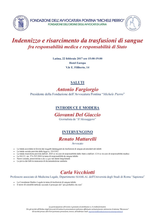 "Indennizzo e risarcimento da trasfusioni di sangue, fra responsabilità medica e responsabilità di Stato". Questo il tema del convegno che si terrà a Latina, all’Hotel Europa, mercoledì 22 febbraio. A...