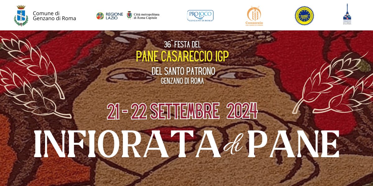 Per la prima volta ci saràun’“Infiorata di Pane” a Genzano in occasione della Festa del Santo Patrono, San Tommaso da Villanova, e del Pane casareccio IGP di Genzano, che si svolge da oggi a domenica 22 Settembre. Sabato, lungo via Nazario Sauro, sarà possibile assistere alla realizzazione di 4 quadri con i materiali per la panificazione; saranno ammirabili fino a domenica sera.