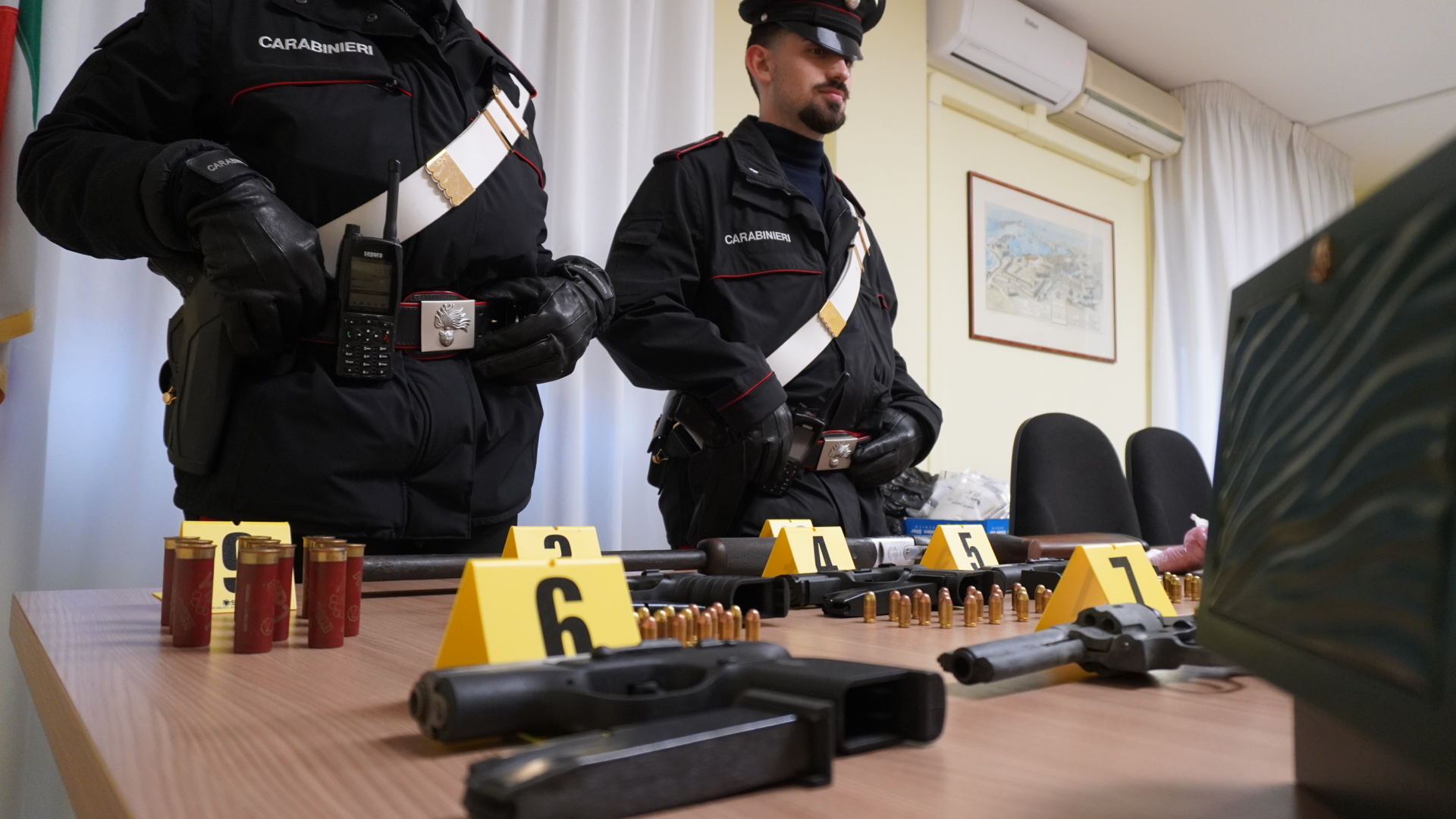 Le persone che avevano la disponibilità del locale dove sono state trovate le armi e le bombe, padre, madre e figlio, non interessati dall’ordinanza del Tribunale e non indagati nel relativo procedimento, sono stati arrestati in flagranza, in attesa della convalida. Nel corso delle perquisizioni, nelle fasi di notifica dell’ordinanza i Carabinieri hanno inoltre trovato e sequestrato a carico di quattro degli indagati 49mila euro in contanti.