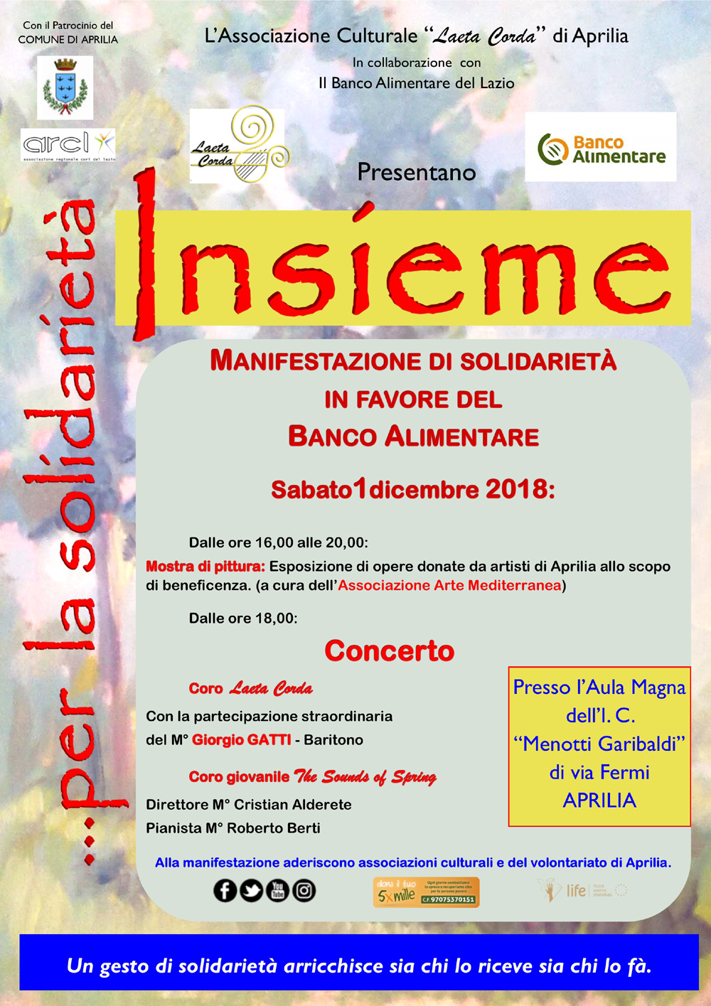 Dopo il buon successo della raccolta alimentare dello scorso 24 novembre, sabato 1° dicembre ad Aprilia si terrà l'iniziativa “Insieme per la solidarietà” organizzata dall’associazione culturale “Laet...
