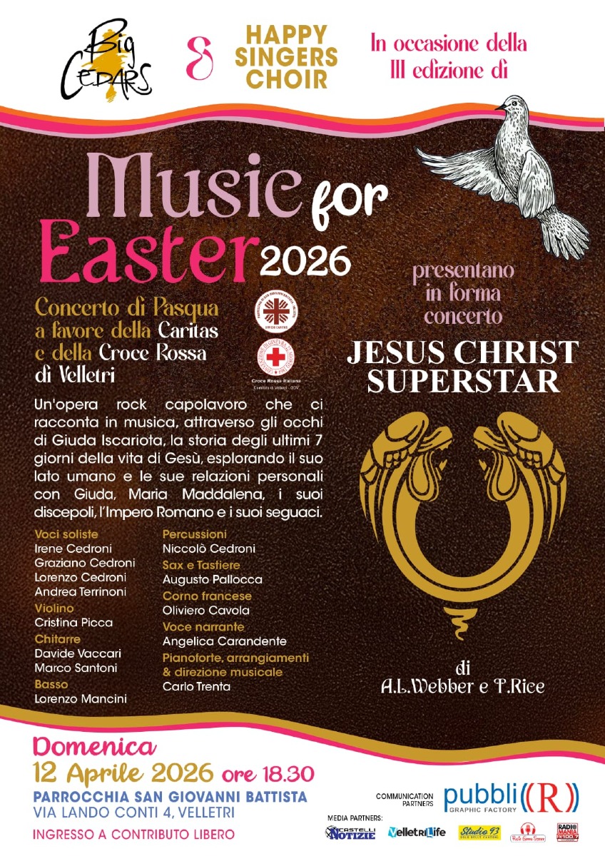 Il celebre musical di Broadway “Jesus Christ Superstar” sarà in scena a Velletri. Appuntamento domenica 12 aprile alle 18.30 presso la Parrocchia San Giovanni Battista a Velletri. Ad esibirsi: Big Cedars & Happy Singers Choir