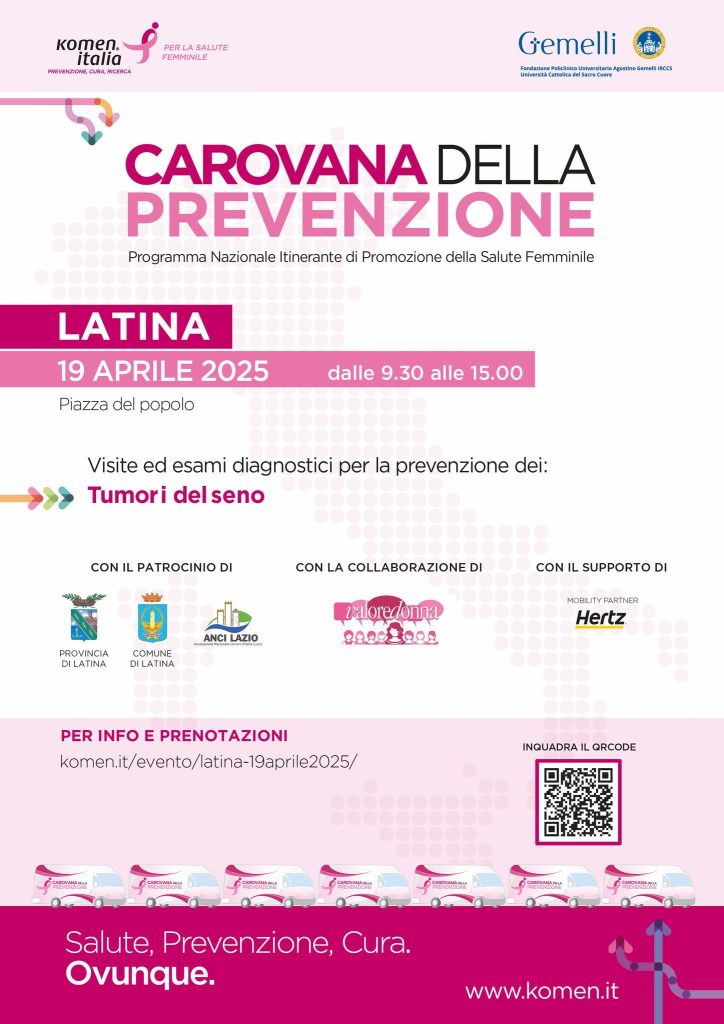 Quella nel capoluogo pontino rappresenta solamente l’ultima tappa della Carovana della Prevenzione, il Programma Nazionale Itinerante di Promozione della Salute Femminile di Komen Italia che offre ad un pubblico sempre più ampio attività gratuite di sensibilizzazione e prevenzione delle principali patologie oncologiche di genere.