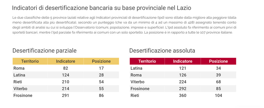 Questi dati rapportati all’andamento della Regione Lazio e delle altre Provincie sembrerebbero posizionare meglio la provincia pontina, secondo quanto ci rappresenta il Segretario Viola, illustrando le seguenti tabelle che rappresentano appunto gli indicatori di desertificazione nel Lazio: Latina si presenterebbe meno desertificata soprattutto in termini di desertificazione assoluta:
