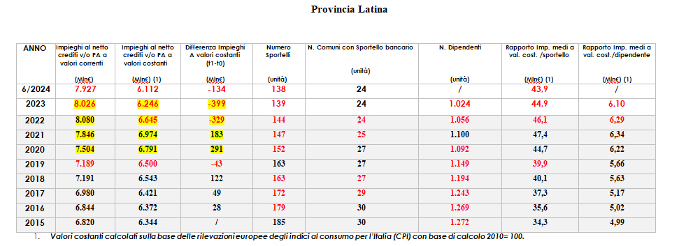 Questo processo di desertificazione ha impattato pesantemente anche la Provincia di Latina, come evidenzia il Segretario di Latina Antonio Viola presentando la tabella allegata ed elaborata a cura della First Cisl regionale su dati Banca di Italia e che rappresenta l’andamento del settore a partire dal 2015, per la provincia pontina (vedi tabella allegata ):