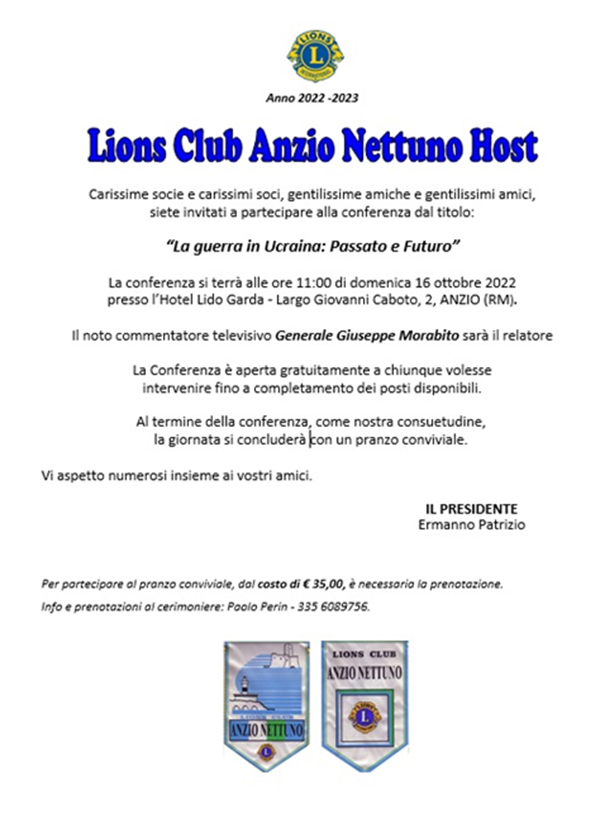 “La Guerra in Ucraina: Passato e futuro”: domenica 16 Ottobre alle 11.00, presso l’Hotel Lido Garda di Anzio, si terrà una conferenza organizzata dal Lions Club Anzio Nettuno Host, presieduto da Ermanno Patrizio. La conferenza sarà tenuta dal Generale Giuseppe Morabito, noto commentatore televisivo, membro del Consiglio Direttivo della NATO. L’ingresso è libero.