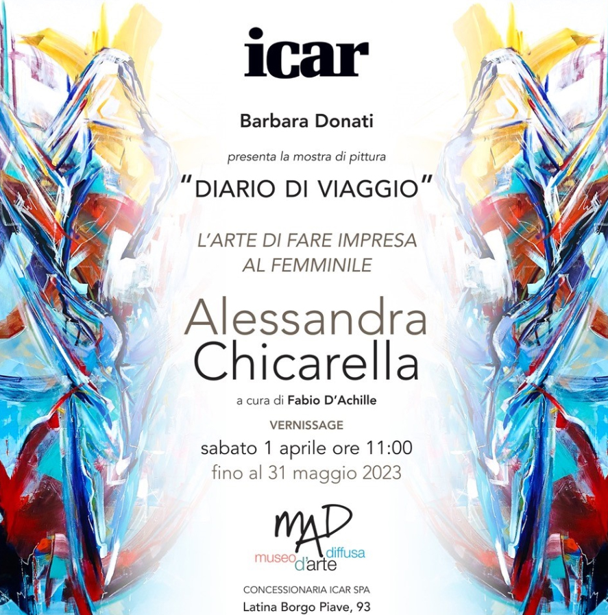 Icar - concessionaria auto a Latina - presenta la mostra di pittura di Alessandra Chicarella dal titolo “Diario di Viaggio”, l’arte di fare impresa al femminile. L’esposizione è a cura di Fabio d’Achille e si terrà da questo sabato primo aprile al 31 maggio 2023 presso la concessionaria Icar spa di Borgo Piave a Latina.