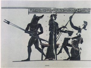 Circe offre la pozione magica. Lekythos a figure nere del 500 a.C.