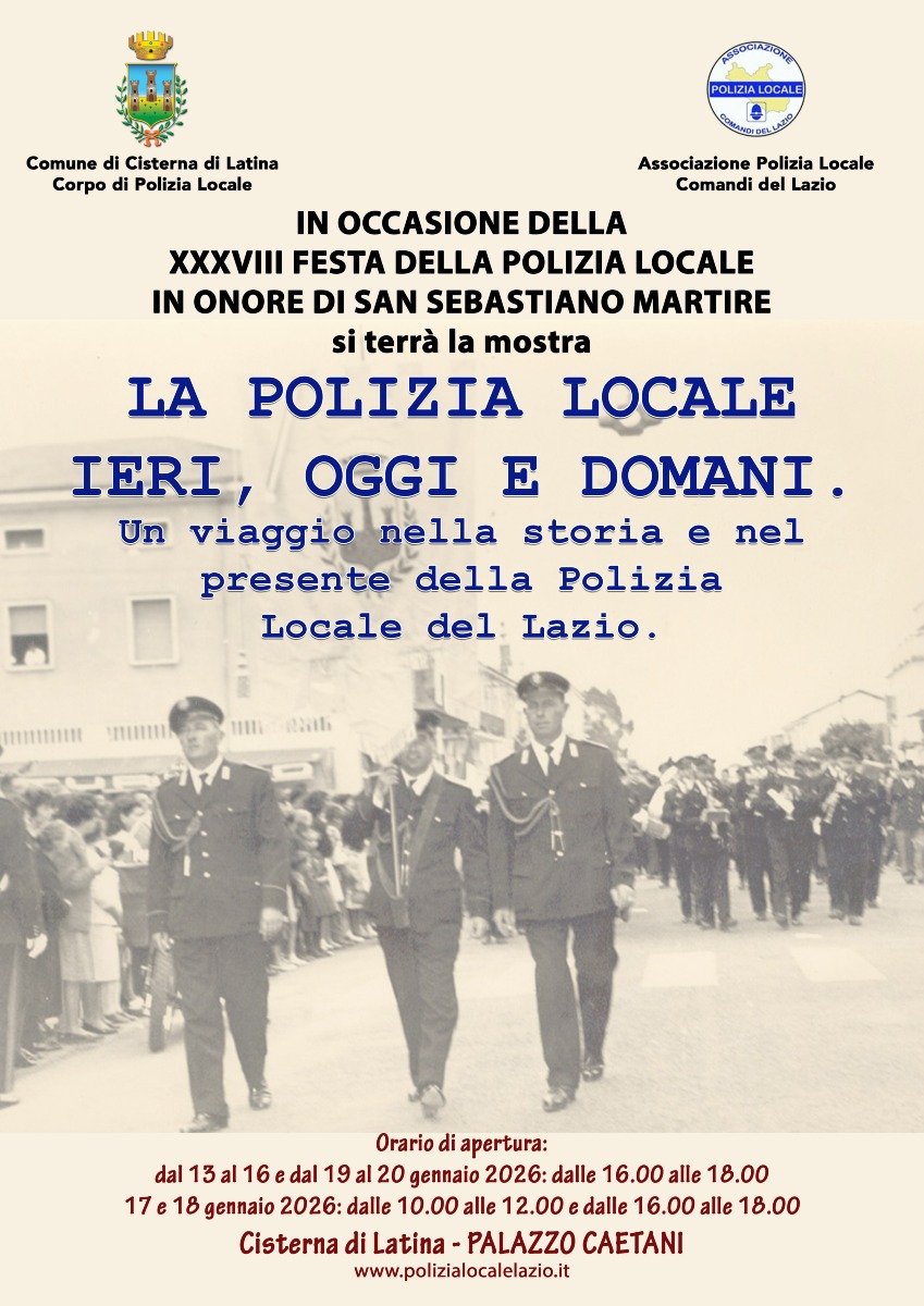 Nell’ambito delle celebrazioni in onore di San Sebastiano Martire, patrono della Polizia Locale, la Polizia Locale di Cisterna di Latina e l’Associazione Polizia Locale Comandi del Lazio promuovono un’iniziativa culturale e divulgativa aperta alla cittadinanza e rivolta, in modo particolare, al mondo della scuola: una mostra che valorizza la memoria storica del Corpo e, al tempo stesso, rafforza il messaggio educativo della prevenzione e della sicurezza.