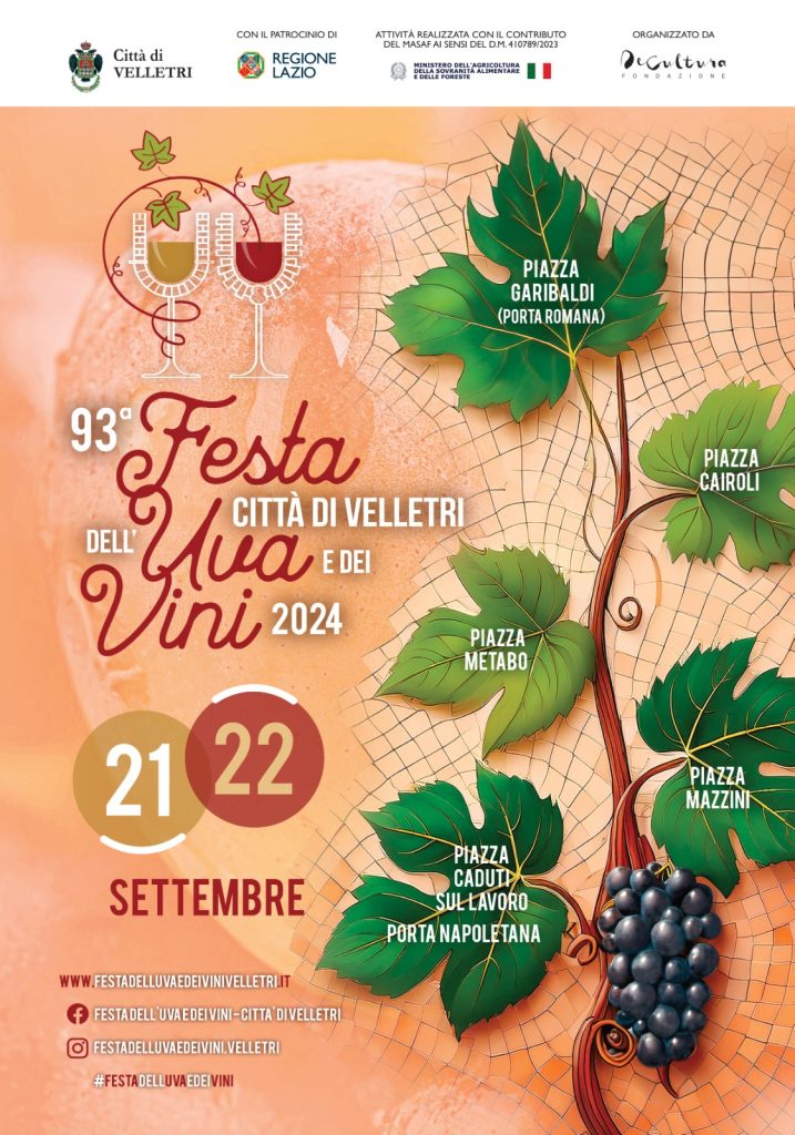 Al via la 93esima edizione della “Festa dell’Uva e dei Vini” a Velletri. Un’esplosione di colori, sapori ed eventi culturali ed enogastronomici invaderà il centro storico sabato 21 e domenica 22 settembre. Per tutto il centro cittadino ci saranno stand, degustazioni enogastronomiche, attività artistiche e culturali, spettacoli teatrali e musicali e non mancheranno, naturalmente, la pigiatura, le musiche popolari e tante altre attività.