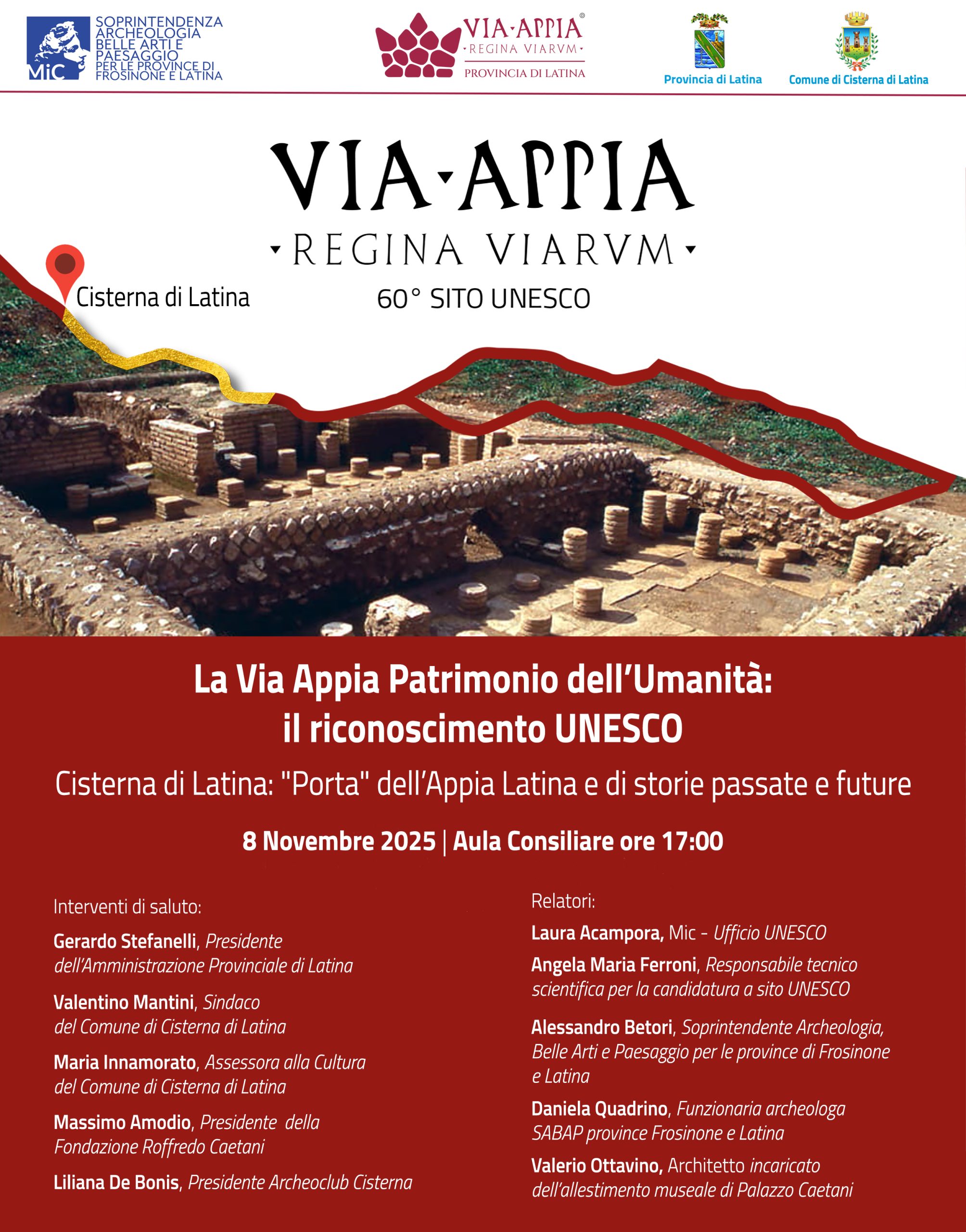 Domani, sabato 8 novembre, alle ore 17:00, l’Aula Consiliare del Comune di Cisterna di Latina ospiterà l’incontro dal titolo “La Via Appia Patrimonio dell’Umanità: il riconoscimento UNESCO”, un momento di grande significato per la città e per l’intero territorio pontino.