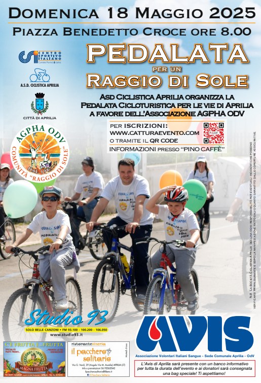 Questa domenica 18 Maggio ad Aprilia torna l’annuale ed ormai tradizionale “Pedalata per un Raggio di Sole” a favore dell’associazione Agpha (l’associazione genitori di portatori di handicap) e per ra...