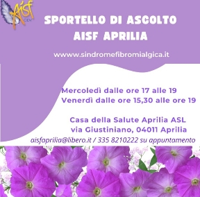 L'Aisf ODV Aprilia Associazione Italiana Sindrome Fibromialgica con sede ad Aprilia presso ASL Lt1 reparto P Via Giustiniano, tramite la Referente Gabriella Lecce e le volontarie, riceve il Paziente Persona per supportare il suo trascorso e consigliando un percorso da seguire al momento.