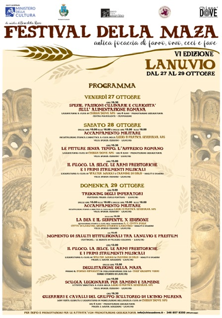 Torna a Lanuvio il Festival della Maza giunto alla sua VI edizione. L’antica focaccia, a base di farro, orzo, ceci e fave, sarà celebrata per un intero fine settimana, da venerdì 27 a domenica 29 Ottobre. In programma laboratori per bambini, rievocazioni storiche, trekking degli imperatori e degustazioni.