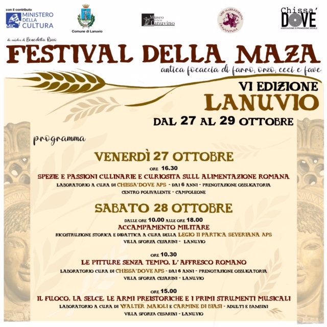 Torna a Lanuvio il Festival della Maza giunto alla sua VI edizione. L’antica focaccia, a base di farro, orzo, ceci e fave, sarà celebrata per un intero fine settimana, da venerdì 27 a domenica 29 Ottobre. In programma laboratori per bambini, rievocazioni storiche, trekking degli imperatori e degustazioni.