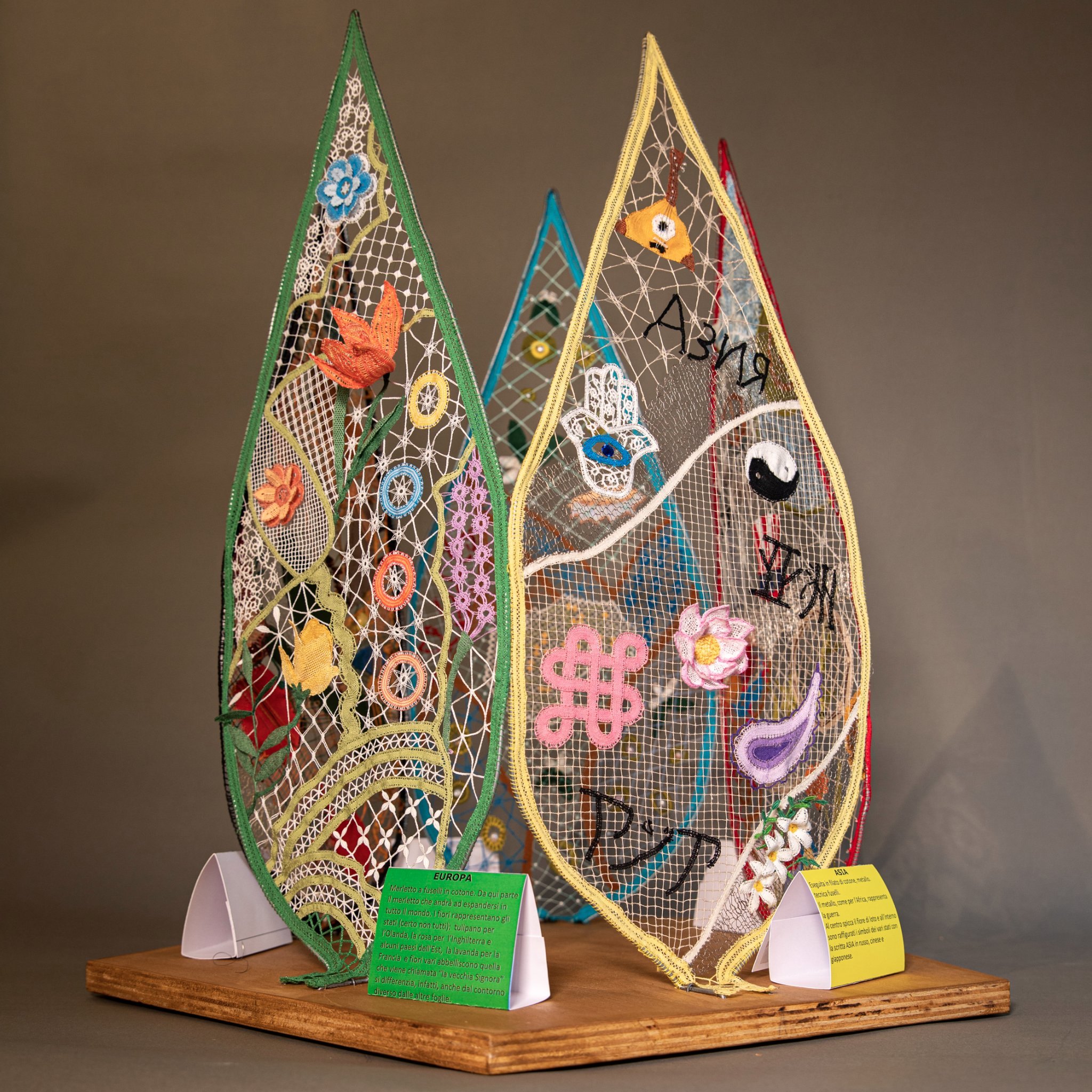 Africa: eseguito in tecniche miste, filati di lino, paglia, metallo e lurex. La pelle sta ad indicare il deserto, la savana, le foreste, e i laghi unite tra loro con lino e rafia a fuselli. Il metallo sta ad indicare le continue guerre; il fiore e le foglioline sono il segno di rinascita; il merletto in oro e pietruzze sta ad indicare le risorse con le quali l'Africa potrebbe riuscire ad auto sostenersi. Asia: eseguita in filato di cotone, metallo, tecnica fuselli. Il metallo, come per l'Africa, rappresenta la guerra. Al centro spicca il fiore di loto e all'interno sono raffigurati i simboli dei vari stati con la scritta Asia in russo, cinese e giapponese. America: eseguito con tecnica a fuselli, filo di cotone. Sulla punta, lavorato in macramè, le cascate del Nord: simboli delle tribù indiane, lo zio Sam, il pozzo di petrolio e il metallo che separa il nord dal sud a confermare le contraddizioni di questo continente. Il sud è arricchito da fiori e simboli dei vari paesi. Oceania: Merletto a fuselli e filet di Bosa che rappresenta l'Australia anche nei fiori, isolotti abbelliti da perle e conchiglie, fiori di tiarè tipici delle isole; perline di corallo formano la barriera corallina. Pensando alla distanza delle isole vediamo l'unità stessa dell'arcipelago. Europa: merletto a fuselli in cotone. Da qui parte il merletto che andrà ad espandersi in tutto il mondo. I fiori rappresentano gli stati: tulipano per l’Olanda, la rosa per l’Inghilterra e alcuni paesi dell'Est, la lavanda per la Francia e fiori vari abbelliscono quella che viene chiamata “la vecchia Signora” si differenzia, infatti, anche dal contorno diverso dalle altre foglie.