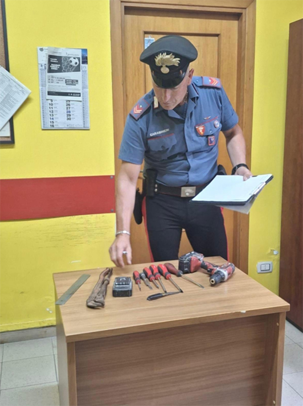 La conseguente perquisizione personale e veicolare ha permesso ai militari dell’Arma di rinvenire, nella disponibilità dell’indagato, un coltello a serramanico, nonché un trapano e vari attrezzi atti allo scasso, che sono stati posti tutti sotto sequestro.
