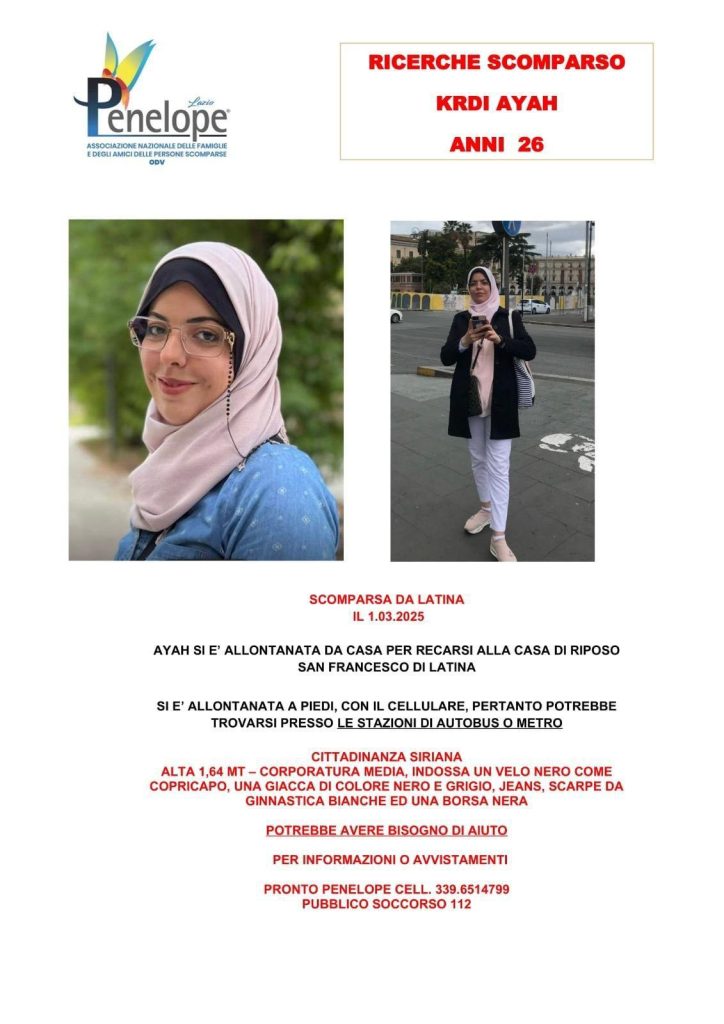 E’ stata ritrovata la 26enne Ayah Krdi scomparsa da sabato scorso dopo che era uscita di casa dicendo che andava a portare il curriculum in una Rsa di Latina dove voleva lavorare come Oss senza fare ritorno.