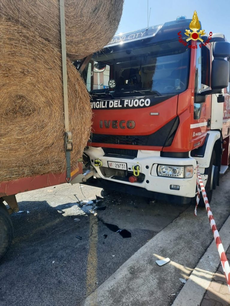 Si sgancia il rimorchio dal trattore, carico di balle di fieno, e va a finire contro un mezzo dei vigili del fuoco. L’incidente, che fortunatamente non ha avuto conseguenze gravi, è avvenuto ieri mattina a Borgo Sabotino, a Latina. I pompieri della squadra 1A erano impegnati in un intervento quando il rimorchio agricolo è andato a finire contro il loro mezzo, rimasto danneggiato nella parte anteriore.