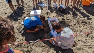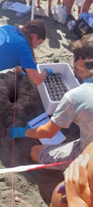 A scorgere le piccole “sfere” bianche, proprio nel momento in cui una tartaruga le deponeva, è stata una donna, mentre passeggiava, ancor prima dell’alba, lungo un tratto di arenile libero al centro del lungomare di Latina. Al sorgere del sole, la stessa donna ha subito effettuato la segnalazione al numero verde 1530 della Capitaneria di porto. L’autorità marittima, tempestivamente, ha quindi allertato la rete regionale TartaLazio per la messa in sicurezza del nido. A Capoportiere, già nella prima mattinata di oggi, infatti, sono arrivati gli operatori di TartaLazio. Il nido, dunque, è stato spostato più a monte, per metterlo a riparo da eventuali mareggiate, e recintato.