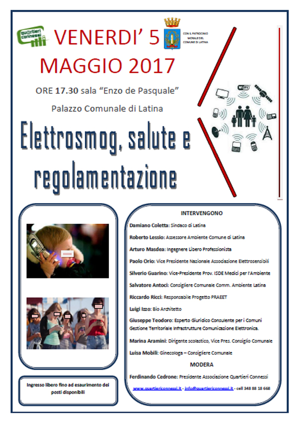 L’evento, che ha ottenuto il Patrocinio Morale del Comune di Latina, vede la presenza di ospiti illustri, locali e di fama nazionale, come il dr. Paolo Orio (MI), vice presidente associazione italiana Elettrosensibili, e l’ing. Arturo Masdea, libero professionista con esperienza decennale nel settore.