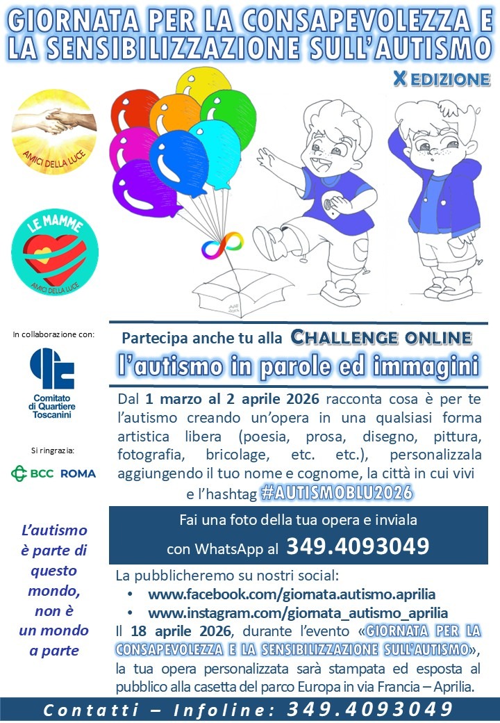 Anche quest'anno la sezione "Le mamme" di Aprilia dell'Associazione "Amici della Luce" con il supporto del Comitato di quartiere Toscanini ed in collaborazione con varie realtà del territorio che si occupano di autismo, organizza la campagna di sensibilizzazione sull'autismo, giunta alla sua 10° edizione.