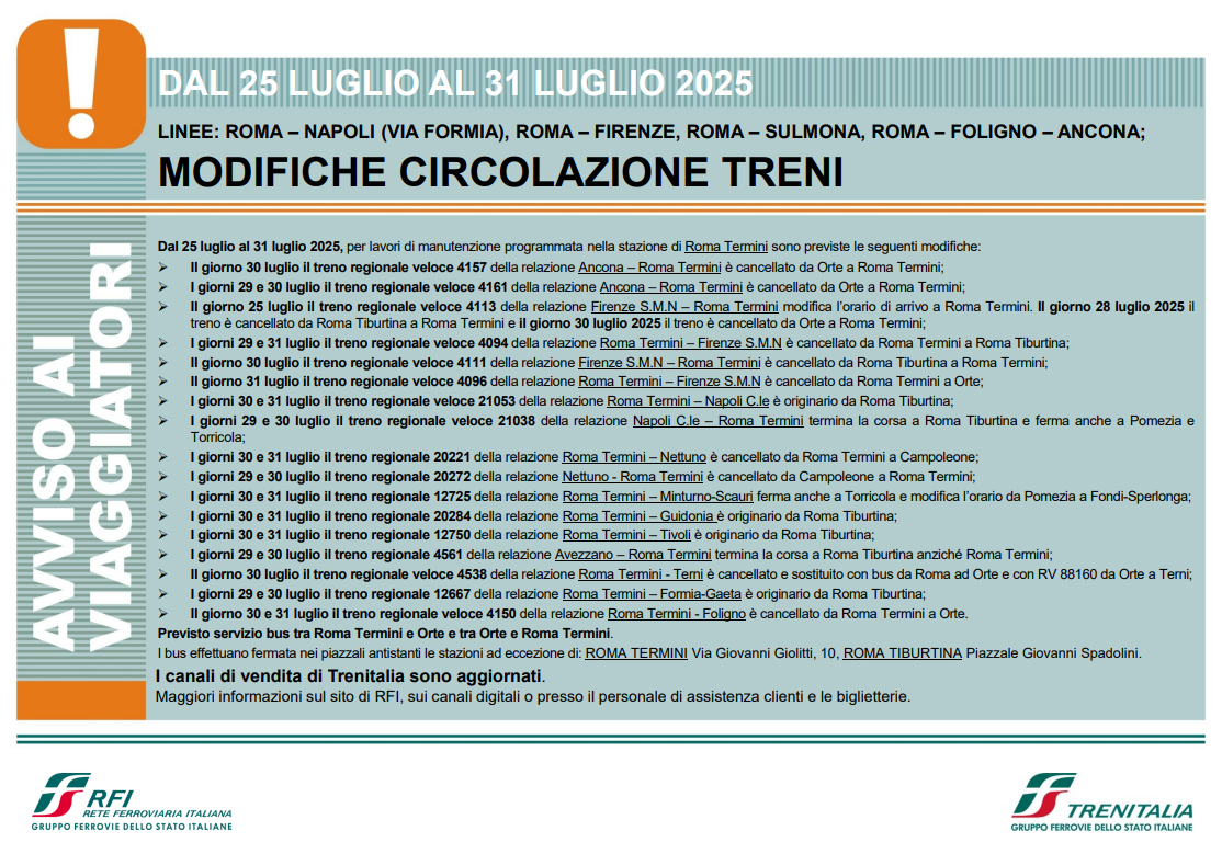 Lavori di manutenzione alla stazione di Roma Termini: da questo venerdì 25 luglio e sino al prossimo giovedì 31 luglio alcuni treni regionali subiranno cancellazioni, limitazioni di percorso e modifiche d’orario. Sono interessate anche le linee ferroviarie Roma-Nettuno e Roma-Napoli via Formia. Sarà attivo un servizio con bus.