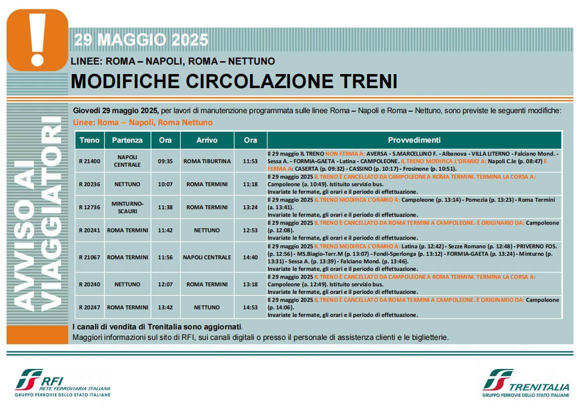Sulle linee ferroviarie FL7 ed FL78, vale a dire la Roma-Nettuno e la Roma-Napoli via Formia, questo giovedì 29 maggio sono previste modifiche alla circolazione dei treni. Sono, infatti, in programma dei lavori di manutenzione da parte della Rete Ferroviaria Italiana. La circolazione ferroviaria di alcuni treni regionali subirà variazioni d’orario o limitazioni di percorso. Sono previsti dei bus sostitutivi.
