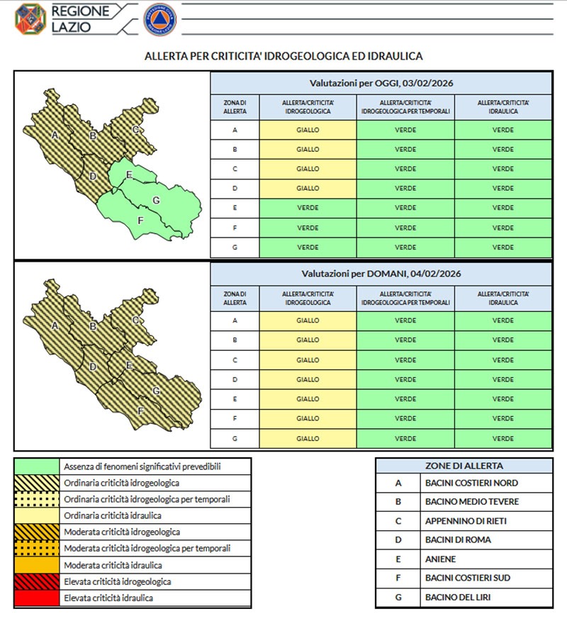 Lazio, allerta meteo da questo pomeriggio per le successive 24-36 ore.