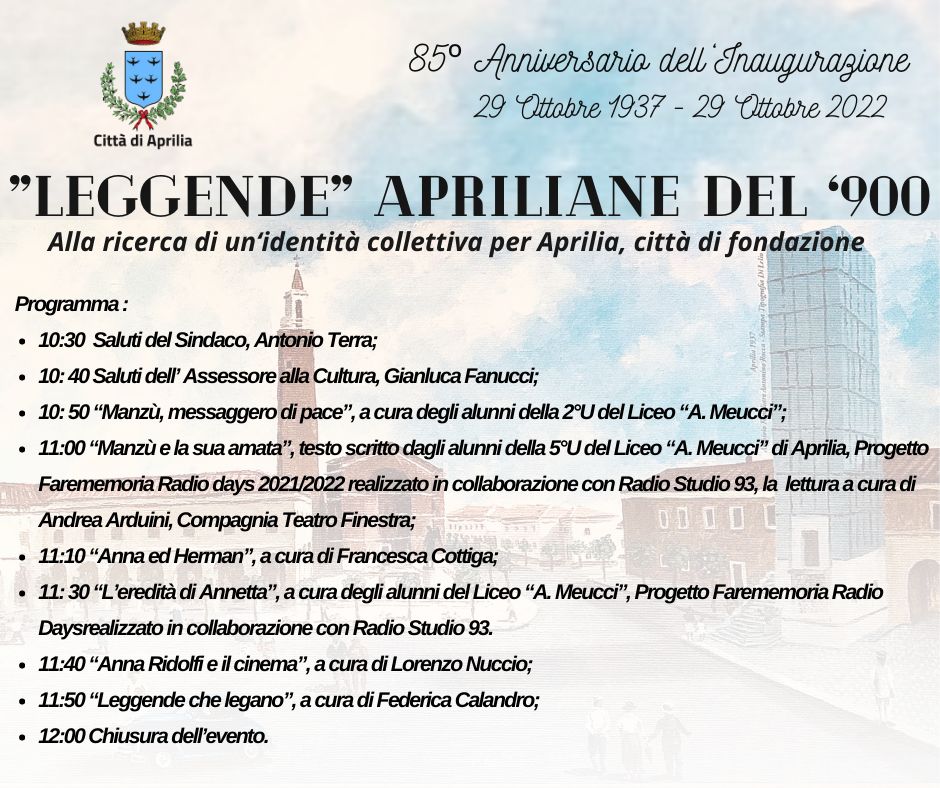 “Leggende apriliane del ‘900”: questo sabato 29 ottobre le celebrazioni in occasione dell’85esimo anniversario dell’inaugurazione della città di Aprilia. Dalle 10.30 alle 12.00, presso l’aula Consiliare Luigi Meddi, si terrà l’iniziativa che, oltre ad omaggiare l’evento inaugurale della città di fondazione - avvenuto il 29 ottobre del 1937 - guarda alla ricerca dell’identità collettiva del territorio apriliano, con una serie di racconti e testimonianze esemplari.