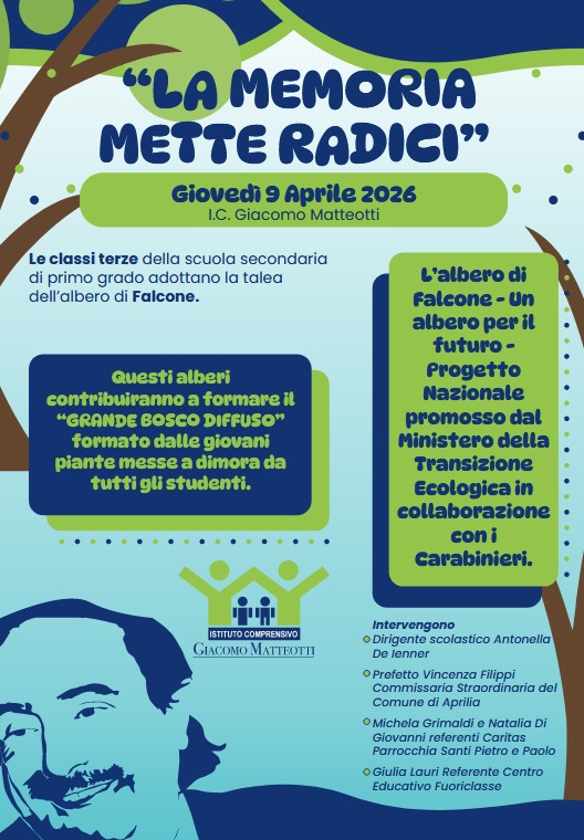 L’Istituto Comprensivo “Giacomo Matteotti” di Aprilia adotterà la talea di Giovanni Falcone. Giovedì 9 aprile, presso la scuola di via Respighi, alle 10.30, si celebrerà la “Giornata della Legalità - un Albero per il Futuro”, con un significativo momento, alle 11.00, dedicato all’adozione dell’Albero di Falcone, che verrà poi messo a dimora. Nel corso della mattinata verrà anche inaugurata la “Mostra per la Pace”. Sarà presente anche il Prefetto Vincenza Filippi, commissaria straordinaria del Comune di Aprilia.