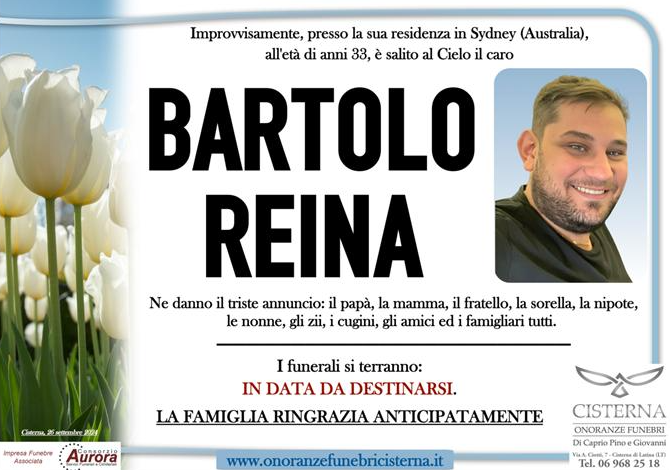 Lo chef Bartolo Reina, 33enne originario di Cisterna, è stato trovato morto lo scorso mercoledì nel suo appartamento a Sidney, in Australia, dove era emigrato e lavorava da diversi anni. Il decesso sarebbe avvenuto per cause naturali, un malore improvviso.