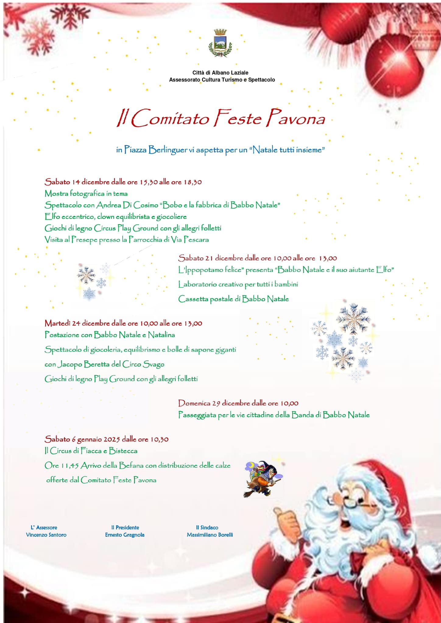 Alle 11.45, infine, è previsto l’arrivo della Befana a Pavona, in Piazza Berlinguer, dove distribuirà calze a tutti i bambini presenti.