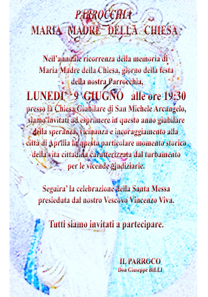 Lunedì 9 giugno ad Aprilia giornata di festa per Parrocchia Maria Madre della Chiesa, guidata dal parroco Don Giuseppe Billi. Per l’occasione, alle 19.30, presso la chiesa Giubilare di San Michele Ar...