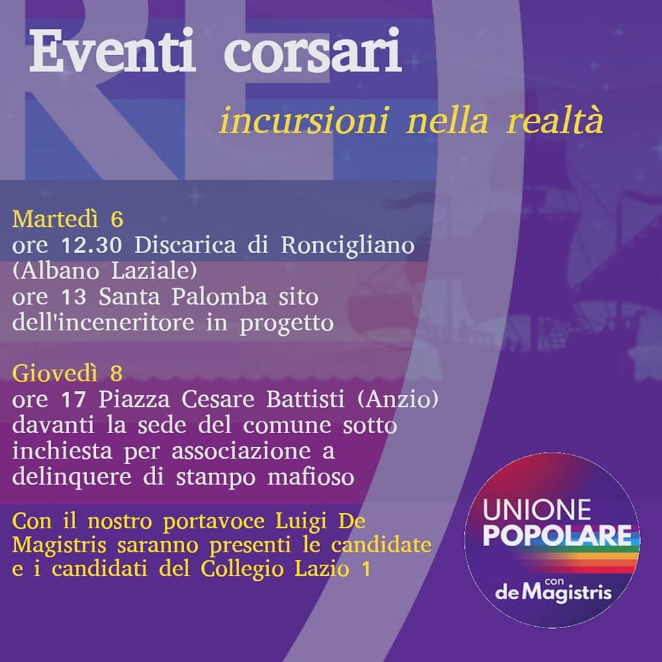 Giovedì prossimo, 8 settembre, alle 17.00 sotto la sede del Comune di Anzio, in Piazza Cesare Battisti, ci sarà l’incontro con la cittadinanza di Anzio e Nettuno del portavoce nazionale dell’Unione Popolare, Luigi De Magistris. L’iniziativa fa parte degli “eventi corsari” ideati per questa campagna elettorale dalla coalizione di cui fanno parte - oltre all’ex sindaco di Napoli e il suo gruppo - Rifondazione Comunista, Potere al Popolo, e diverse realtà politiche e associative.