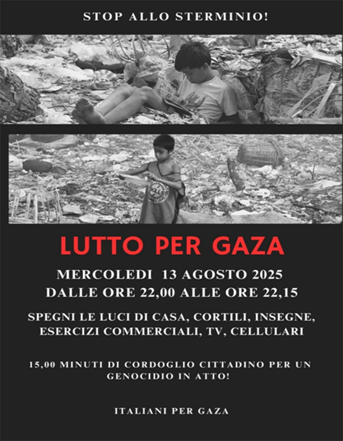 “Mercoledì 13 agosto 2025 dalle ore 22,00 alle ore 22,15 uniamoci alle migliaia di voci in tutto il mondo che con sgomento assistono e protestano ogni giorno e da oltre due anni per l’umiliante e feroce persecuzione e massacro dei palestinesi un popolo inerme composto prevalentemente da bambini, adolescenti e giovani sottoposto a forme di violenza inaudite e che hanno a tutt’oggi causato la morte di 60.000 vittime in prevalenza civili.