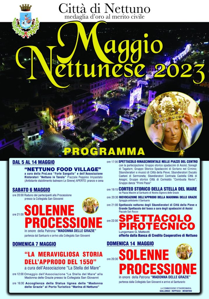 Dal 5 al 14 maggio p.v. a Nettuno si svolgeranno eventi e manifestazioni di vario contenuto, comunque tutte incentrate sul Culto della Madonna delle Grazie, riconducibile all'approdo del 1550, data a partire dalla quale si è sviluppato, alimentandosi nei secoli, la venerazione, diventata tradizione profondamente radicata nella sensibilità e nel sentimento popolare.
