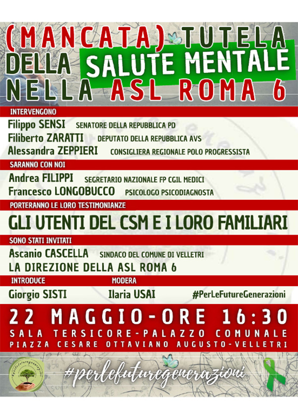 “Il Comitato #PerLeFutureGenerazioni - spiega il presidente, Tonino D’Annibale - organizza l'evento per denunciare le attuali condizioni in cui versa il diritto alla tutela della salute mentale nel distretto 5 della ASL Roma E a causa del depotenziamento del CSM di Velletri e Lariano.