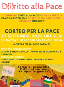 Il comitato Dritti alla Pace, insieme alle realtà associative, alle reti sociali dei CastelliRomani, i sindacati, annuncia che per il 27 settembre 2025 dalle ore 9.30 si terrà unCorteo per la Pace. La...