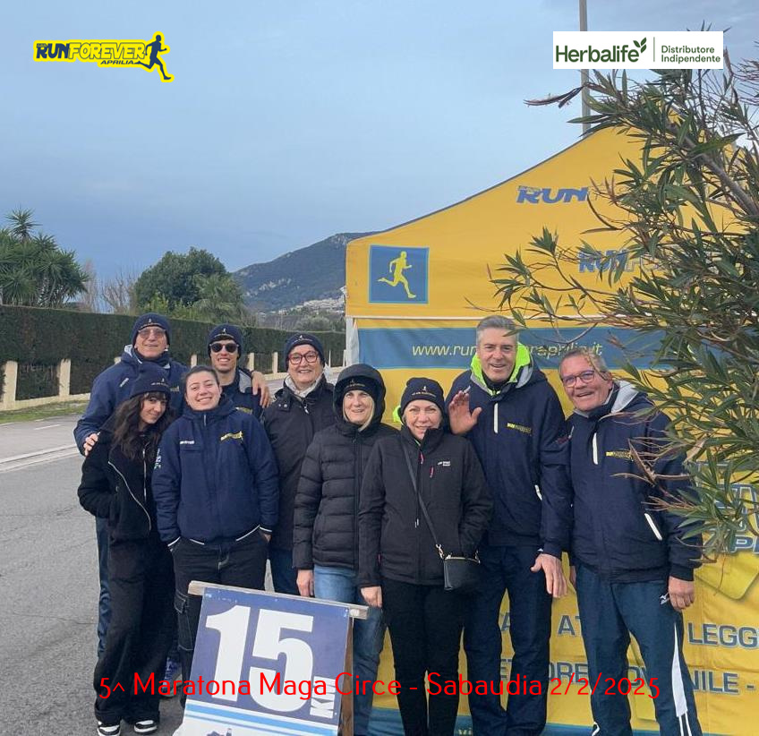 L’ASD Runforever Aprilia era presente sia con i propri atleti che con i volontari che hanno dato una mano all’organizzazione, predisponendo un ristoro al 15° km dove è stato posizionato il gazebo giallo blu che ci contraddistingue ed ormai conosciutissimo da tutti perché presente in tantissime gare.