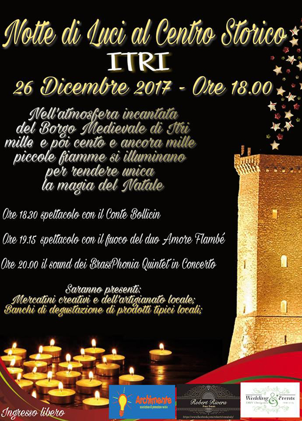 Martedì 26 dicembre, a partire dalle 18.00, nel borgo medievale di Itri si svolge l’evento “Notte di Luci al Centro Storico”. I colori emozionanti di tante piccole fiammelle illumineranno i vicoli, gl...