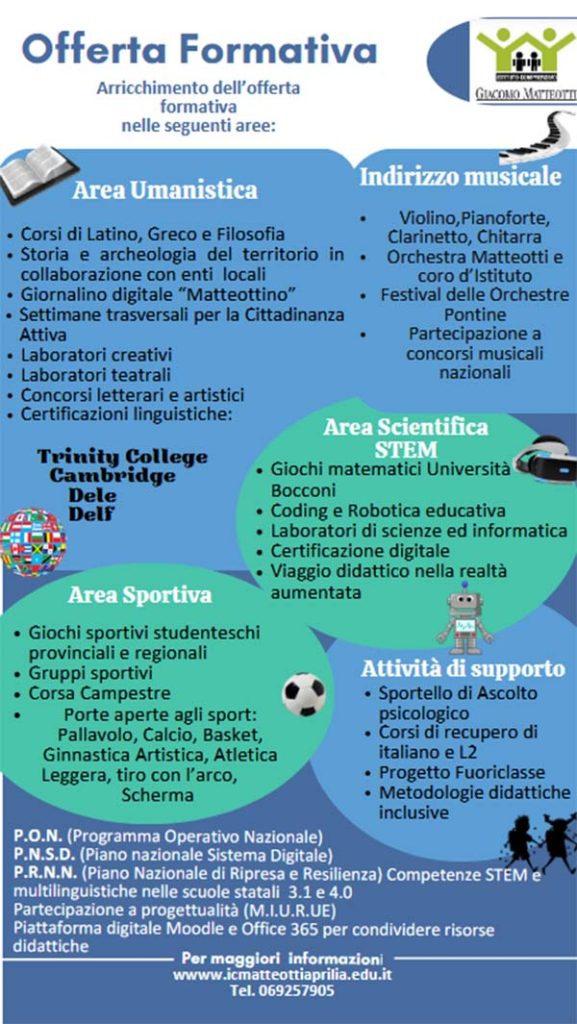 Dopo l’Open Day tenutosi presso la Scuola Secondaria di I grado, in via OttorinoRespighi, al rientro dalle vacanze il Dirigente Scolastico, la Professoressa Giuseppina Rossi, i Docenti e gli alunni saranno lieti di ospitare nuovamente le famiglie. Saranno illustrati i numerosi progetti contenuti nell’Offerta Formativa (Coding, robotica, musica, lingue straniere, cittadinanza, sport, ecc..)