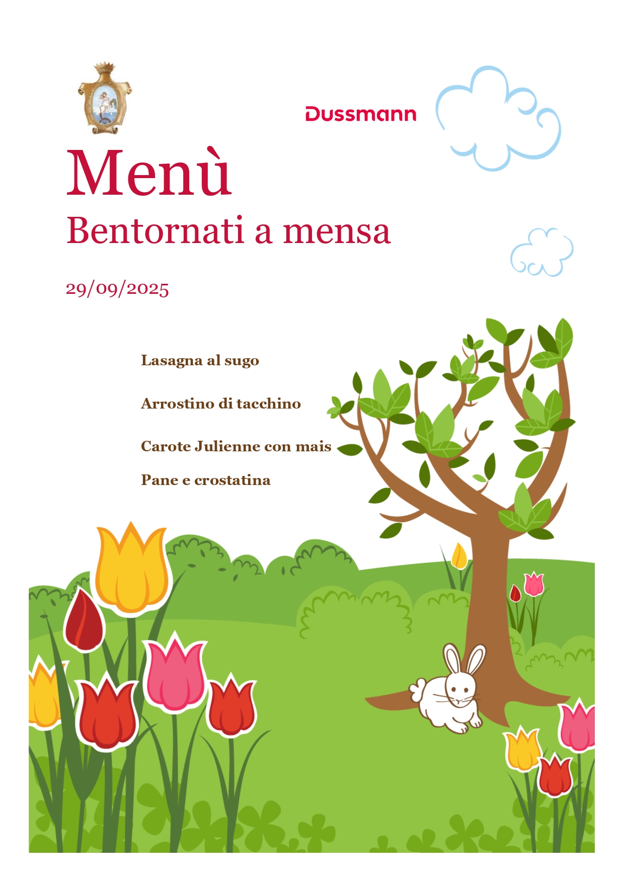 Per il rientro a scuola ci sarà un “menu di benvenuto” con lasagna al sugo, arrostino di tacchino, carote julienne con mais, pane e crostatina.
