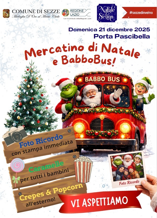 Un importante evento quello organizzato dal Comune di Sezze: domenica 21 dicembre 2025, a Porta Pascibella, è in programma il “Mercatino di Natale e BabboBus”, iniziativa inserita nel cartellone “Natale Setino”, con il contributo della Regione Lazio.