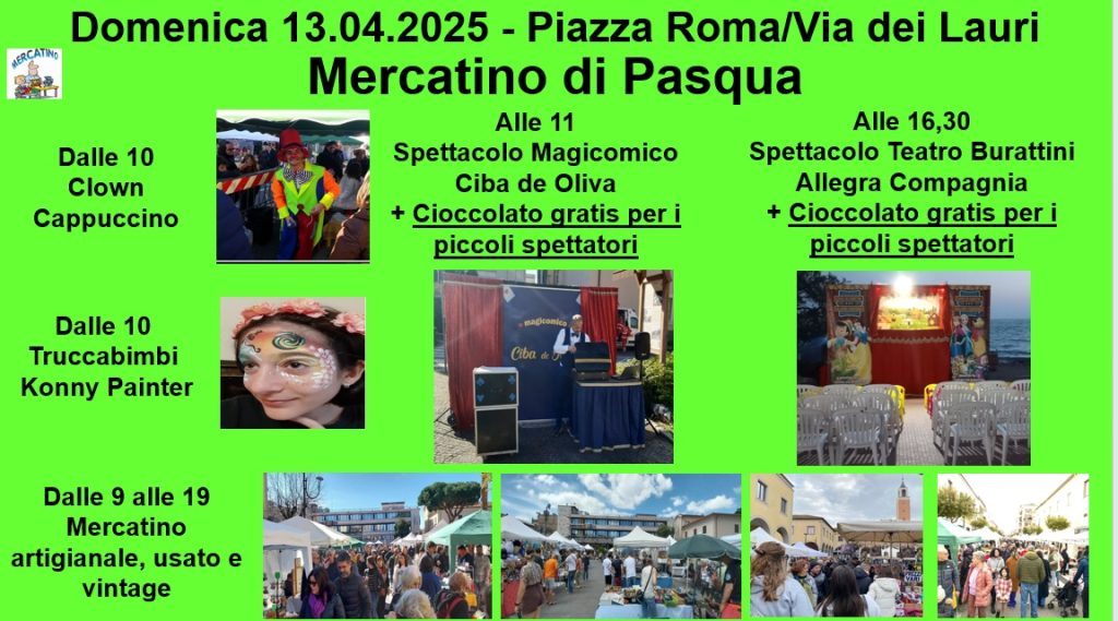 Il Mercatino di Aprilia organizza un evento in vista dei festeggiamenti di Pasqua. L’appuntamento è per domenica 13 aprile in Piazza Roma e Via dei Lauri, con un programma che coprirà l’intera giornata. Si parte alle 9.00 del mattino con l’apertura degli stand del mercatino con oggetti artigianali, usati e vintage. Alle 10.00 ci sarà il Clown Cappuccino con la sua allegria ed i suoi palloncini e la Truccabimbi Konny Painter.